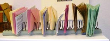 So anyone out there already solved that one?  My thought would be to use a filing crate box with hanging folders. If space is an issue, maybe an expandable file folder from the office store like this one I just found at Kinkos on clearance for $6.
